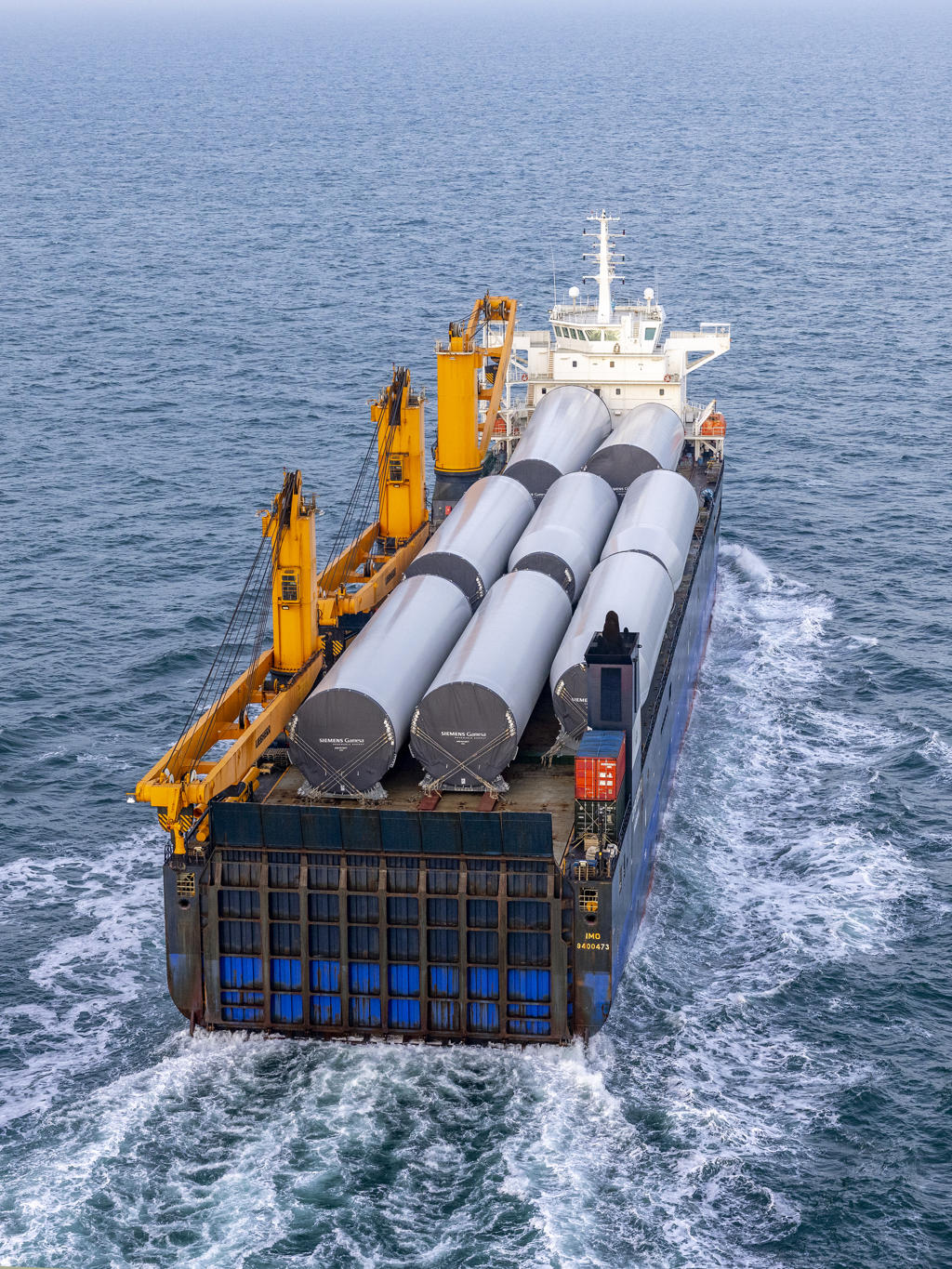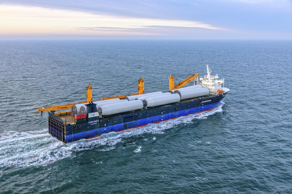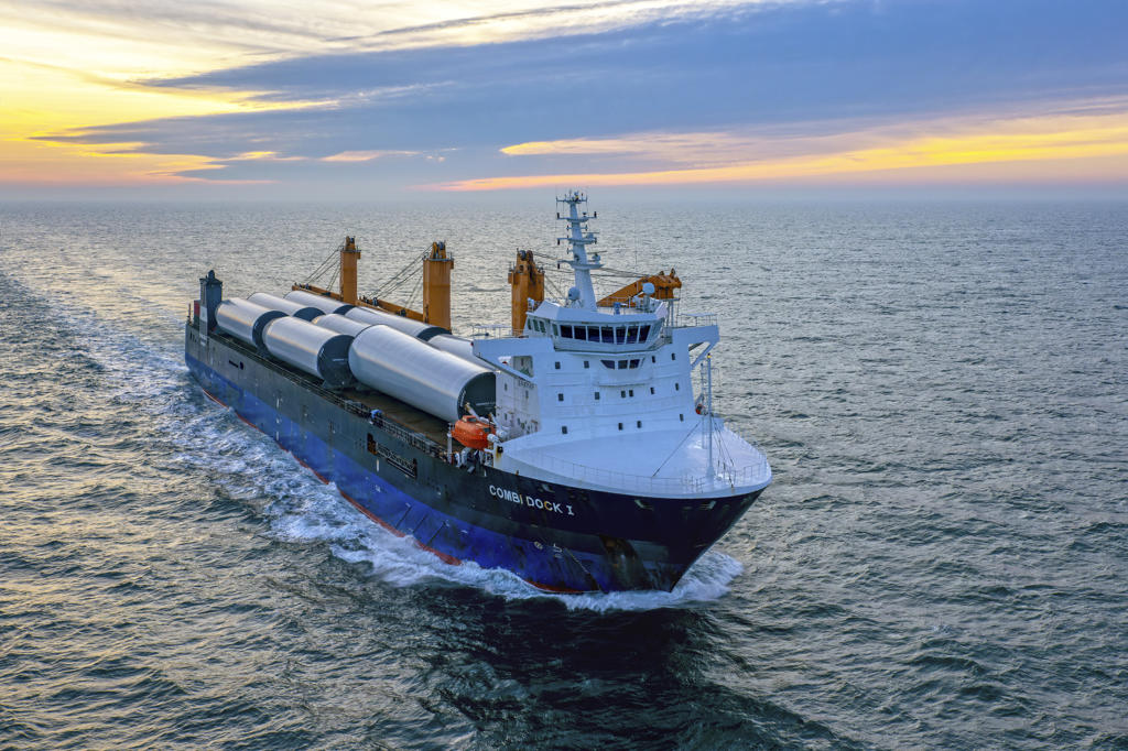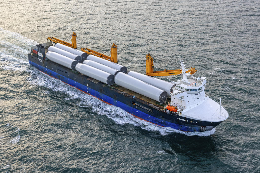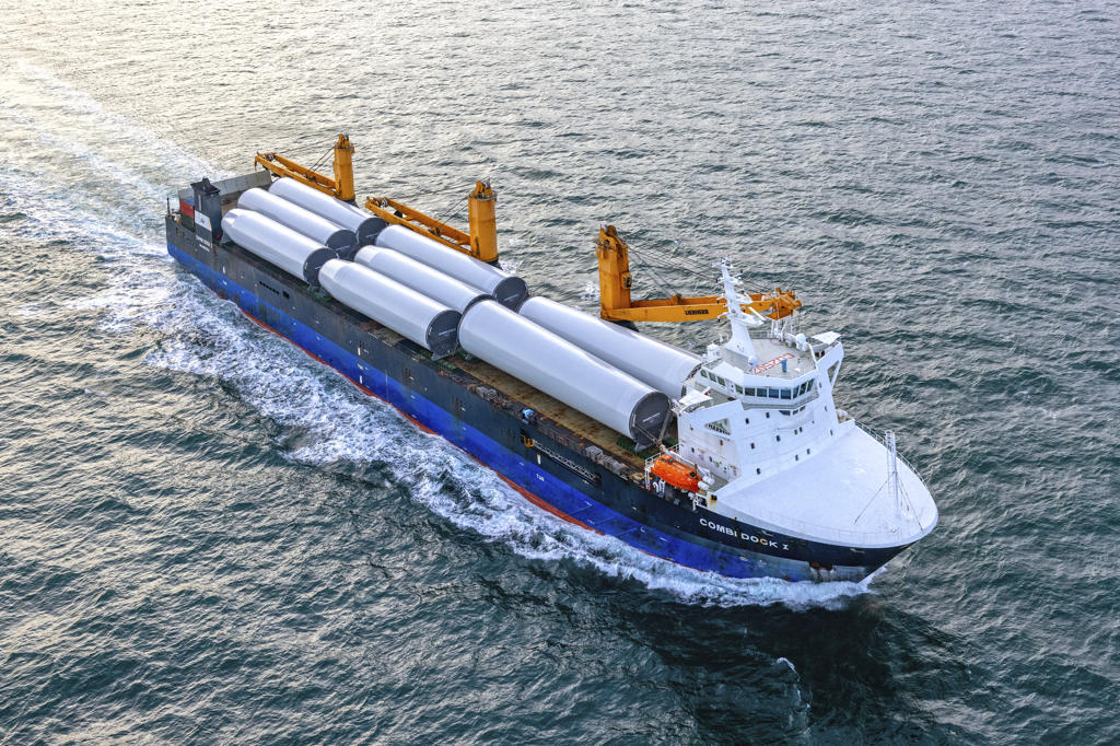 The heavy lift vessel Combi Dock I is transporting wind turbine towers from Seville, Spain, to Northern Europe, supporting offshore wind developments.